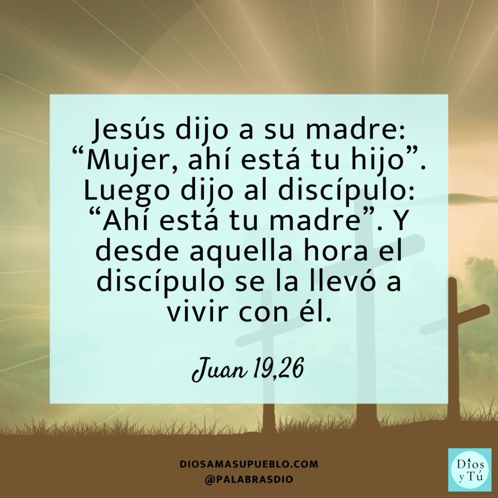 Junto a la cruz de Jesús estaban su madre, la hermana de su madre, María la de Cleofás, y María Magdalena. Al ver a su madre y junto a ella al discípulo que tanto quería, Jesús dijo a su madre: “Mujer, ahí está tu hijo”. Luego dijo al discípulo: “Ahí está tu madre”. Y desde aquella hora el discípulo se la llevó a vivir con él.