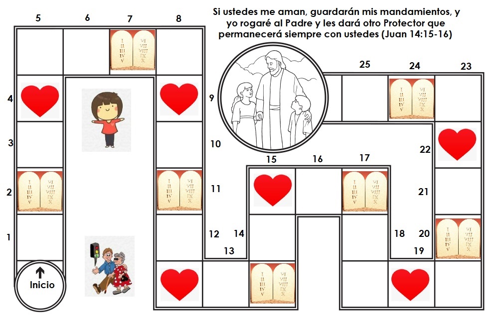 Instrucciones: Coloca un objeto pequeño (piedra, frijol, garbanzo, maíz…) al inicio del camino y lanza un dado, avanza la cantidad de casillas indicadas en el dado, cuando el objeto llegue a la imagen de los mandamientos (casilla: 2, 7, 11…), comparte un mandamiento que puedas cumplir, y si tu objeto llega a un corazón, comparte las acciones que puedes realizar para demostrar tu amor a Jesús. Descarga la Actividad en formato para imprimir en el botón de descarga.
