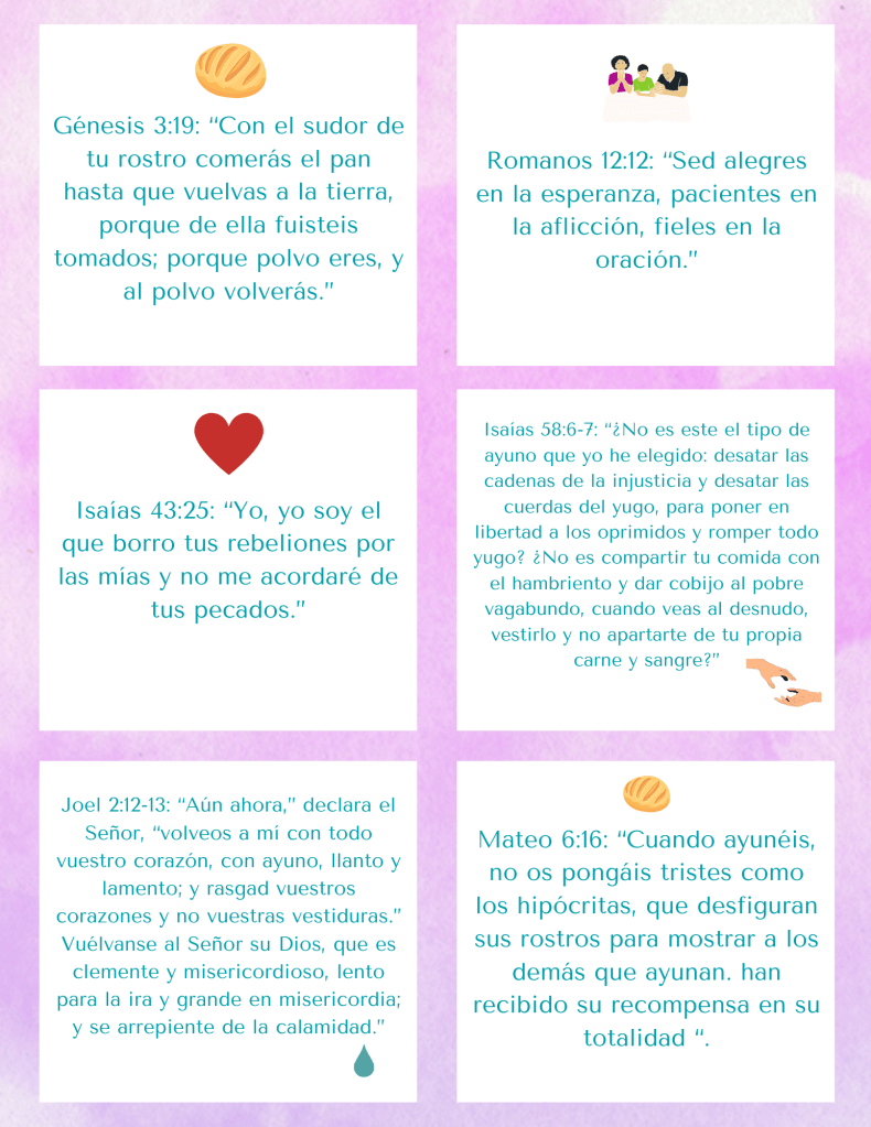 A continuación, encontrarás seis versículos bíblicos para meditar en cuaresma. Recórtalos, y elige los que más te gusten para ponerlos en un lugar donde los puedas ver. Si haces este retiro en familia cada integrante elegirá un versículo y lo memorizará antes de Semana Santa.