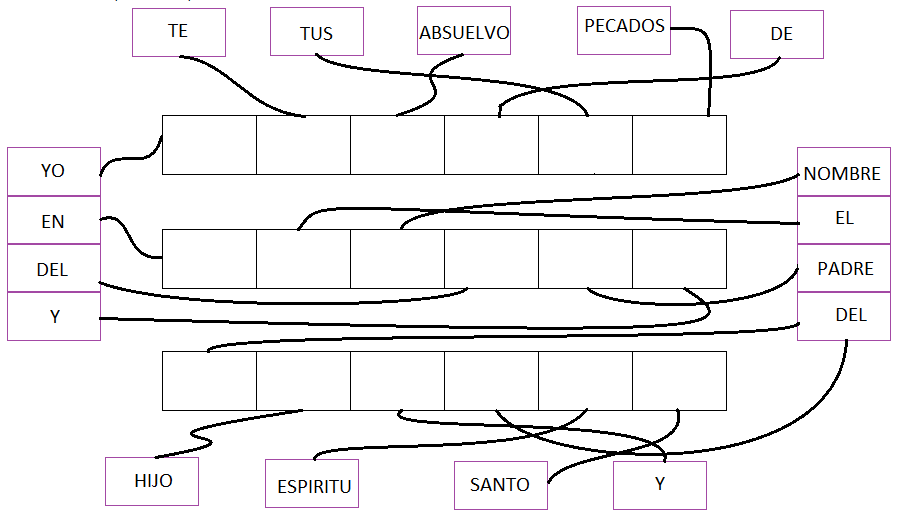 Sigue cada hilo y escribe la palabra que corresponde en el cuadro, al finalizar podrás leer las palabras que pronuncia el Sacerdote en el momento de la absolución.