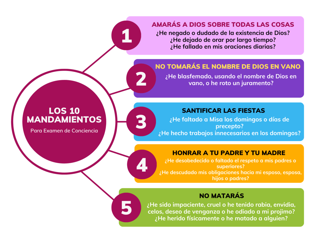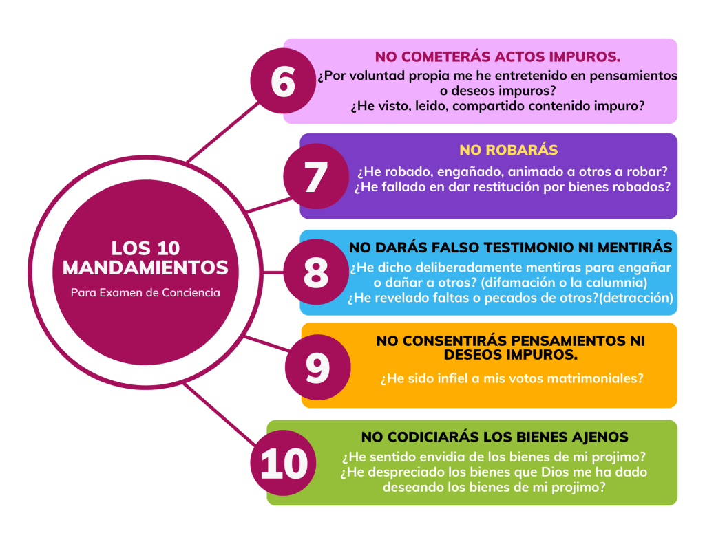 Revisa en las siguientes imágenes, los 10 mandamientos y reflexiona en las preguntas que tiene cada uno para ayudarte a hacer tu examen de conciencia.