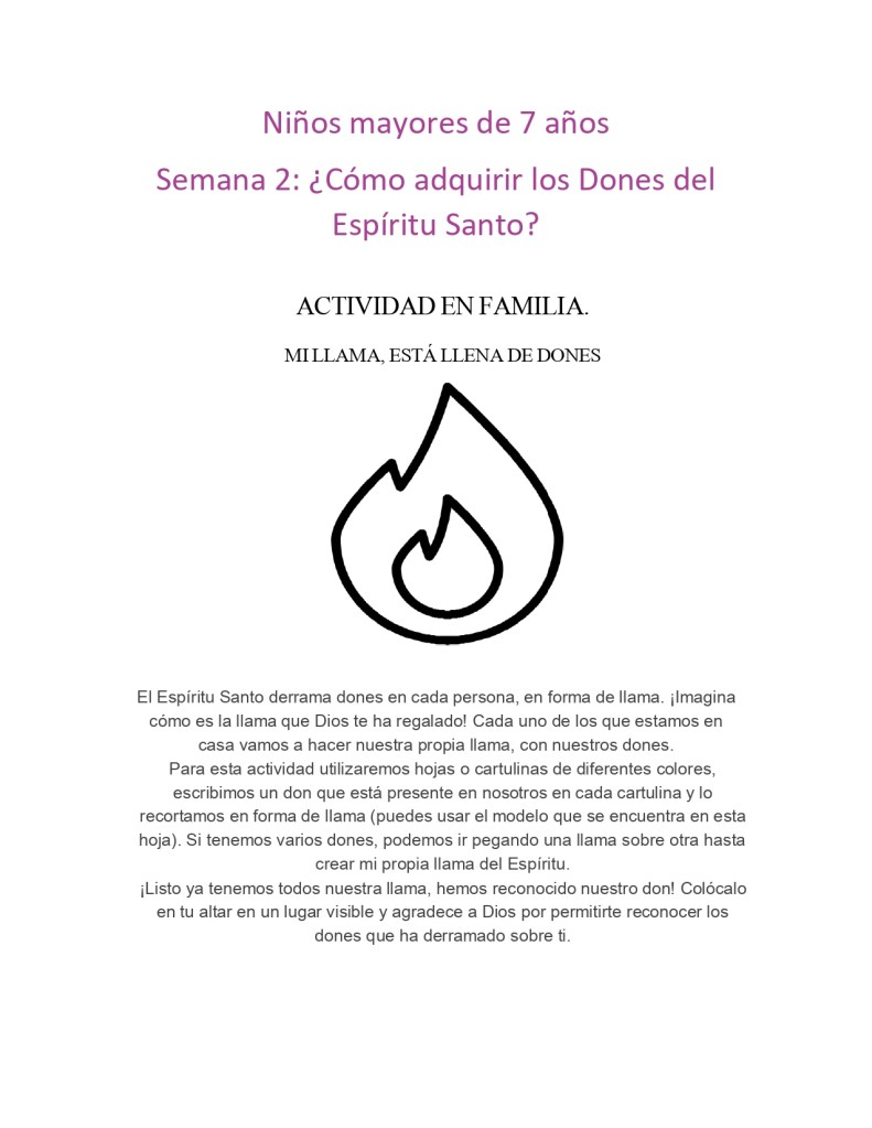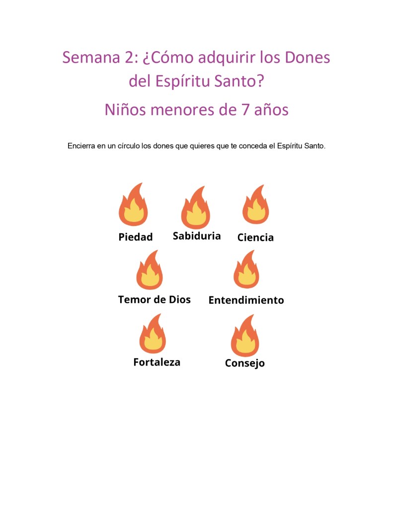 Revisa los propósitos que buscas alcanzar con ayuda de Dios en este retiro definidos en el día 1 y pídele al Espíritu que te de los dones y gracias para poder cumplirlos. Participaremos de la misa el domingo 18 de mayo y de ser posible algún otro día entre semana.