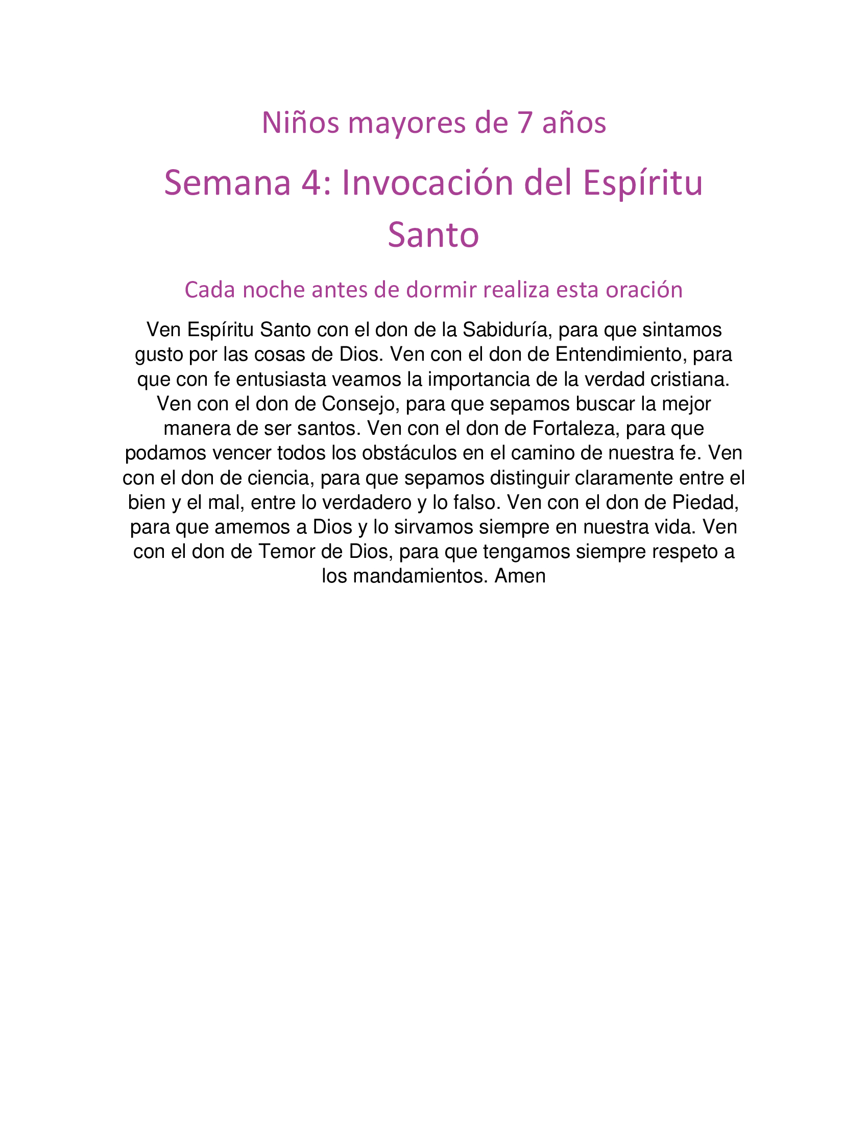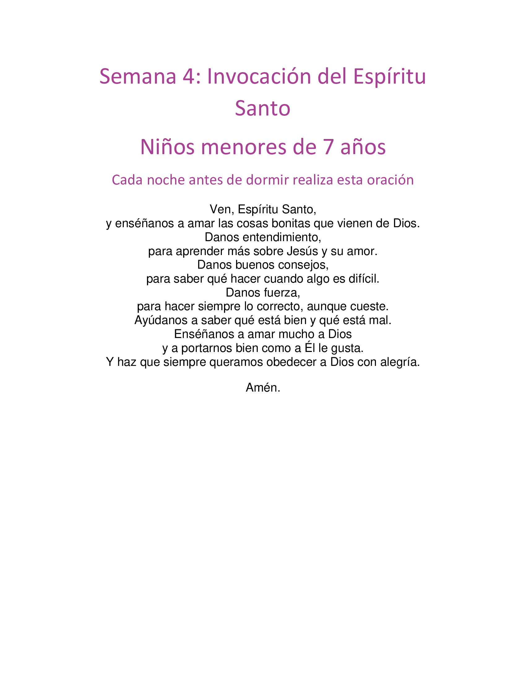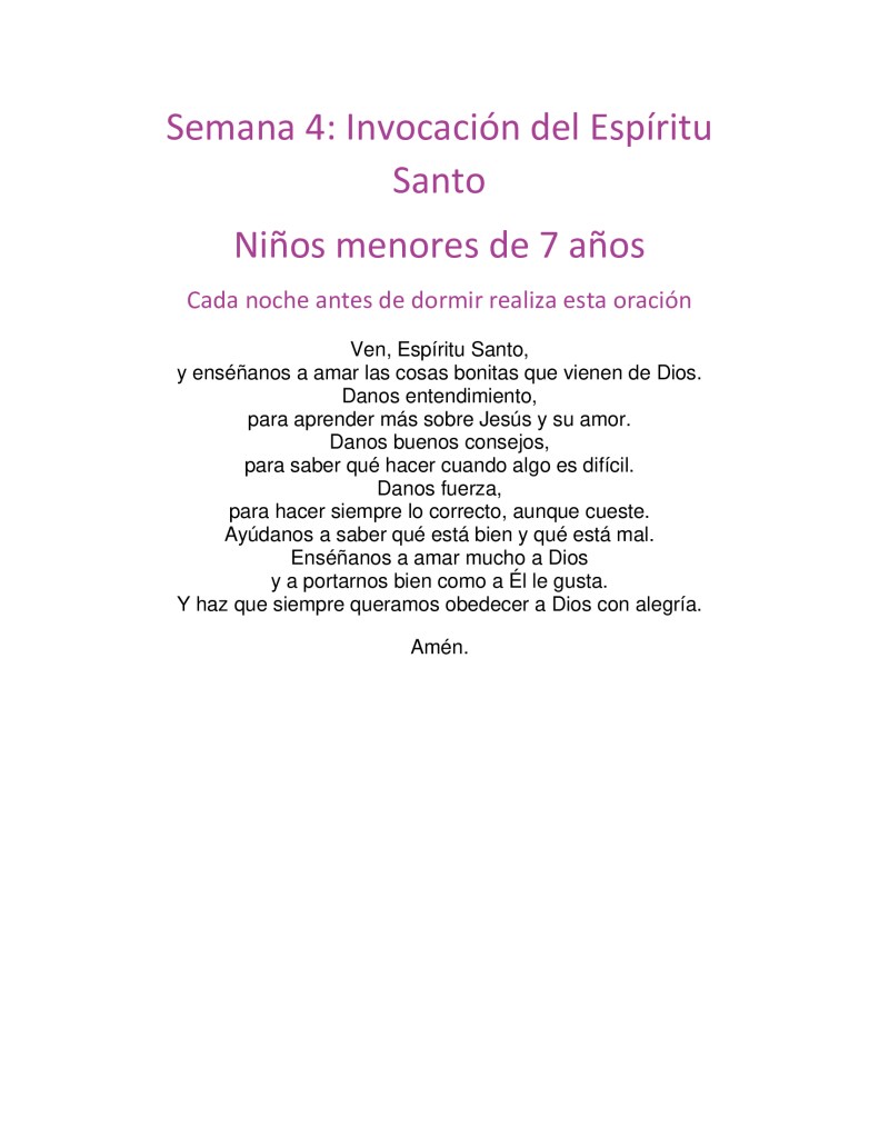 Ven, Espíritu Santo, llena los corazones de tus fieles, y enciende en ellos el fuego de tu amor. Envía tu Espíritu Creador y renueva la faz de la tierra. Oh, Dios, que has iluminado los corazones de tus hijos con la luz del Espíritu Santo; haznos dóciles a sus inspiraciones para gustar siempre el bien y gozar de su consuelo. Por Jesucristo nuestro Señor. Amén.