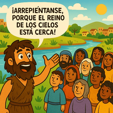 Juan vivía cerca del río Jordán y todos los días hablaba a la gente que venía de pueblos y ciudades cercanas. Con voz fuerte y clara, decía: “¡Arrepiéntanse, porque el reino de los cielos está cerca!” La gente escuchaba atenta, porque sabían que Juan era un mensajero especial enviado por Dios.