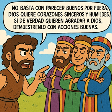 Pero un día, llegaron unos hombres muy importantes del pueblo, que pensaban que ya eran perfectos y no necesitaban cambiar nada. Juan los miró con seriedad y les dijo: “No basta con parecer buenos por fuera. Dios quiere corazones sinceros y humildes. Si de verdad quieren agradar a Dios, demuéstrenlo con acciones buenas.”