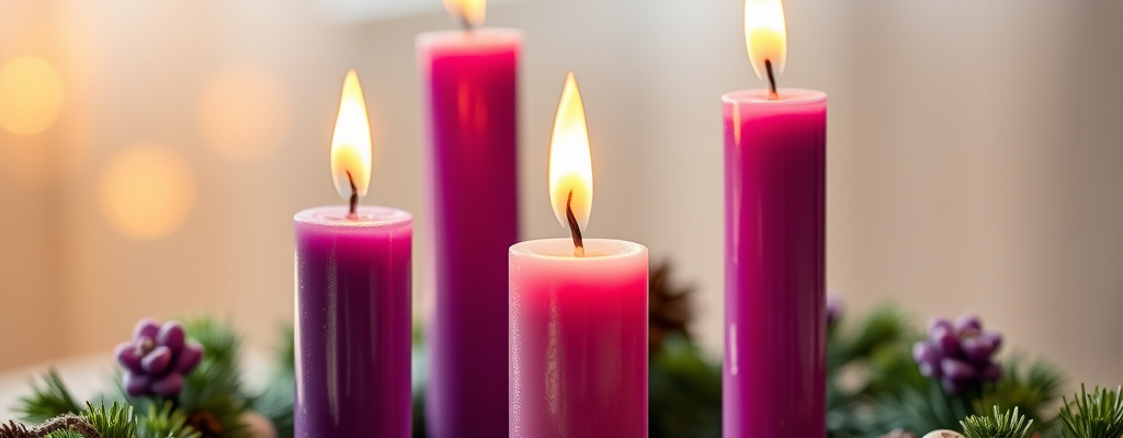 Encendemos tres velas moradas y la vela rosada de la corona de adviento y mientras encendemos las velas llenemos del amor que Jesús nos da, porque Él está presente allí donde te encuentras, su Santo Espíritu ahí está. Deja que Él te abrace con su amor. Si no tienes una corona, puedes encender cualquier vela. El día de Navidad encenderemos una vela blanca también.