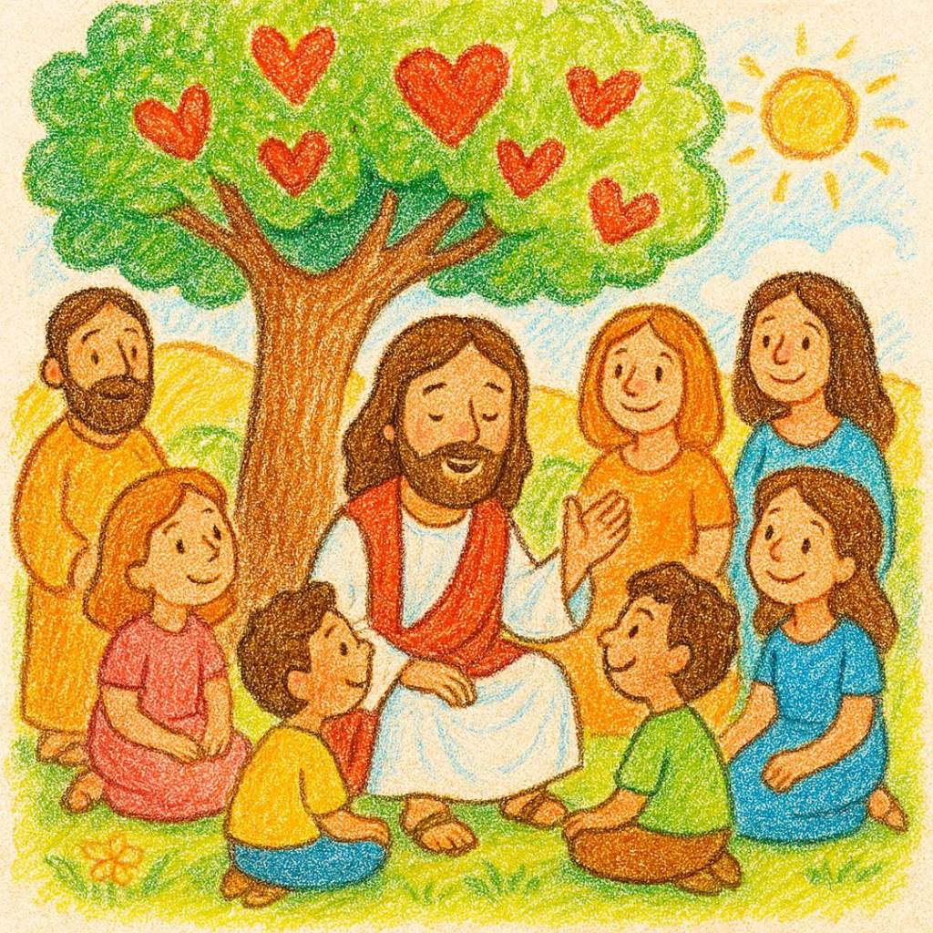 Por las tardes a Jesús le gustaba sentarse bajo el árbol del amor y contar historias a todos los que vivían en el pueblo, enseñaba que todos debían amarse los unos a los otros, perdonarse y ayudarse. Un día, mientras todos escuchaban atentos, Jesús dijo: