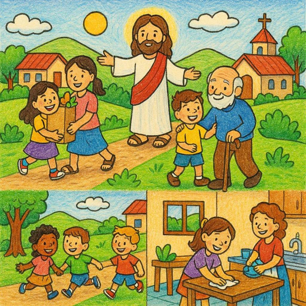 Desde entonces los niños del pueblo empezaron a seguir el ejemplo de Jesús. Ayudaban a sus padres, abuelitos, tíos, amigos, vecinos y siempre estaban listos para servir. Sabían que, al hacerlo, estaban siguiendo el gran ejemplo que Jesús les había dado.