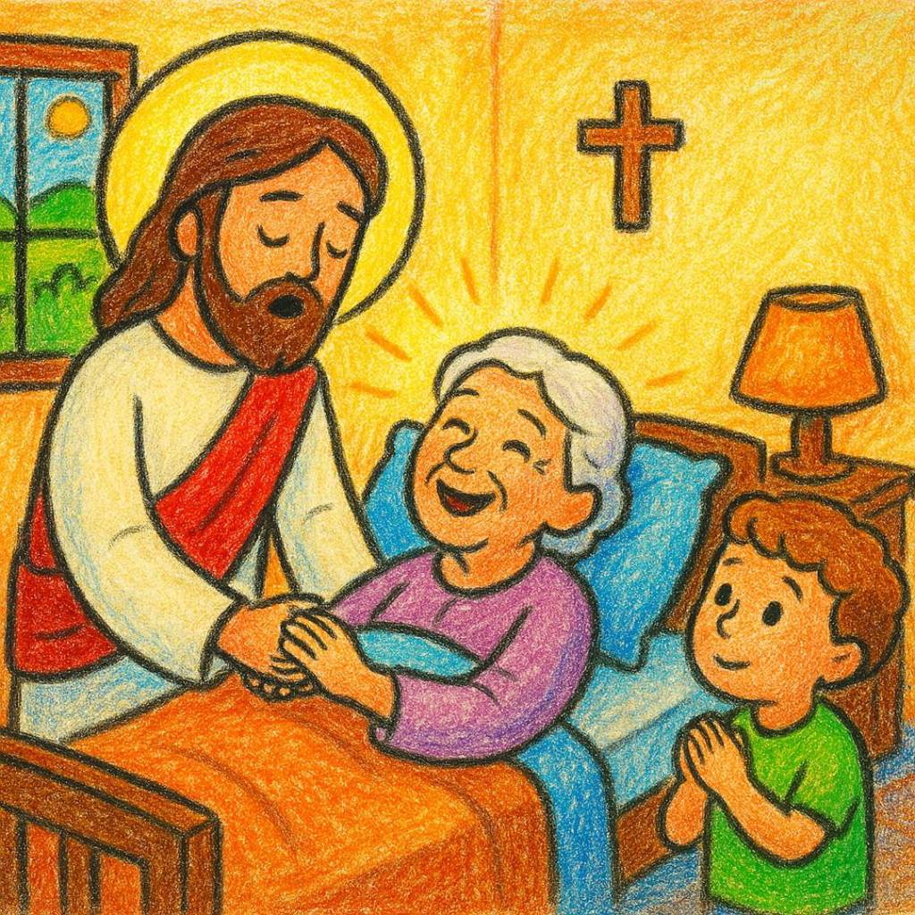 Un día la abuelita de Samuel, uno de los niños del pueblo, se puso muy enferma y Jesús fue a visitarla, la miro con ternura, le tomó la mano, y tras una oración, la abuelita se sanó al instante.