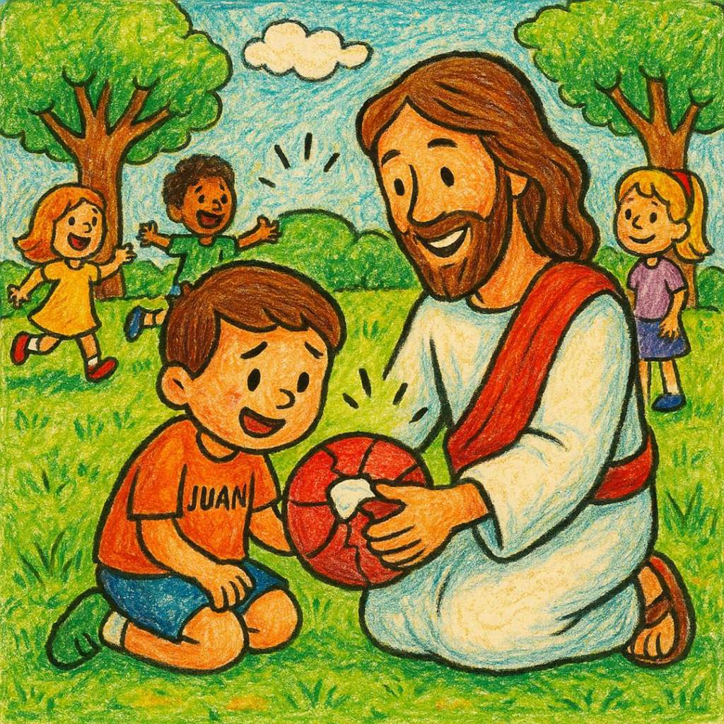Una mañana, mientras los niños jugaban, Jesús vio que uno de ellos, Juan, estaba triste porque su pelota se había roto. Sin dudarlo, Jesús se acercó y sonriendo le preguntó: “¿En qué puedo ayudarte?” Juan le explicó su problema, y Jesús, con mucha paciencia, le ayudó a reparar su pelota.